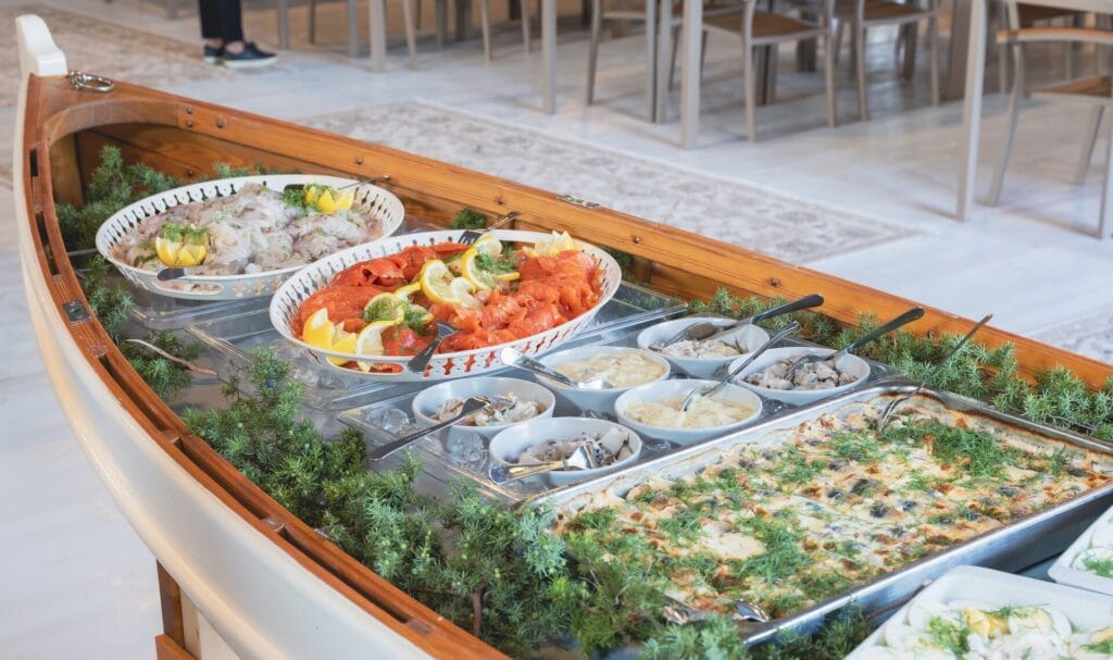 Adding a distinctive touch to the setting, the venue includes a traditional wooden rowing boat, which can be creatively used as part of catering displays or decorative arrangements.