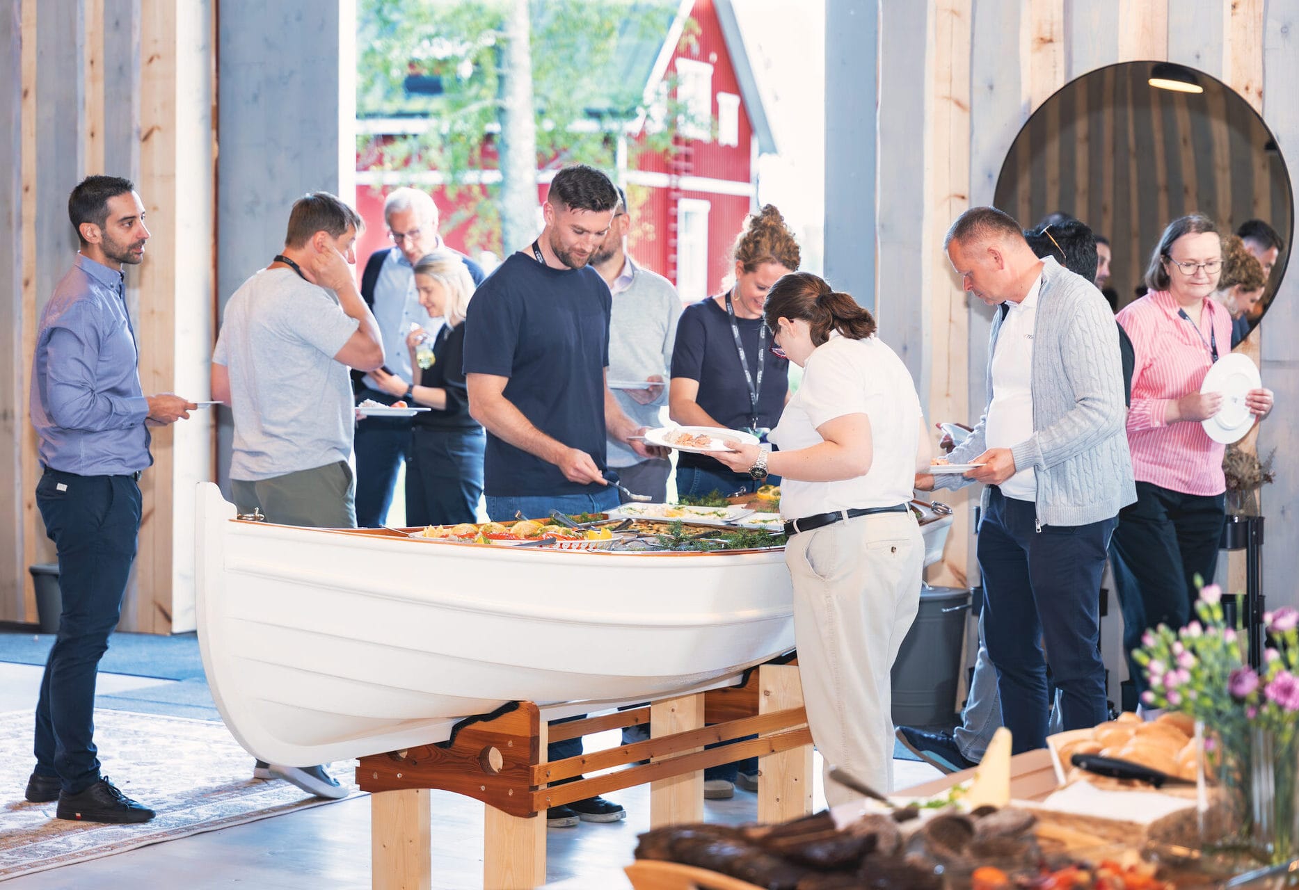 Adding a distinctive touch to the setting, the venue includes a traditional wooden rowing boat, which can be creatively used as part of catering displays or decorative arrangements.